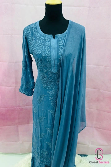 Viscose Georgette Solid 4pc Suit Set - Blue | Closetsecrets