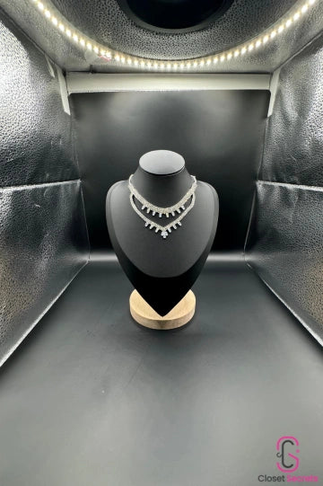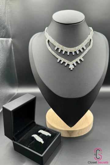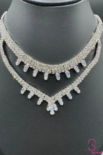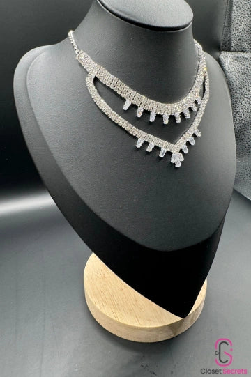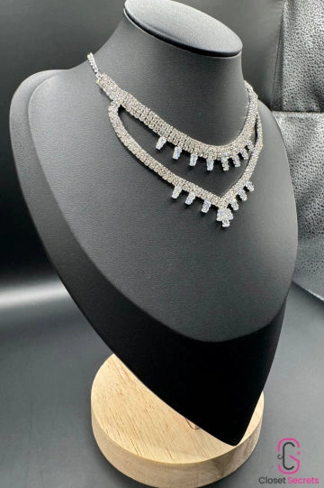 This elegant double-layer necklace features a silver-tone design with sparkling crystal drop accents. The layered structure adds depth, while the dangling crystals bring a sophisticated, eye-catching finish, perfect for formal events or special occasions.