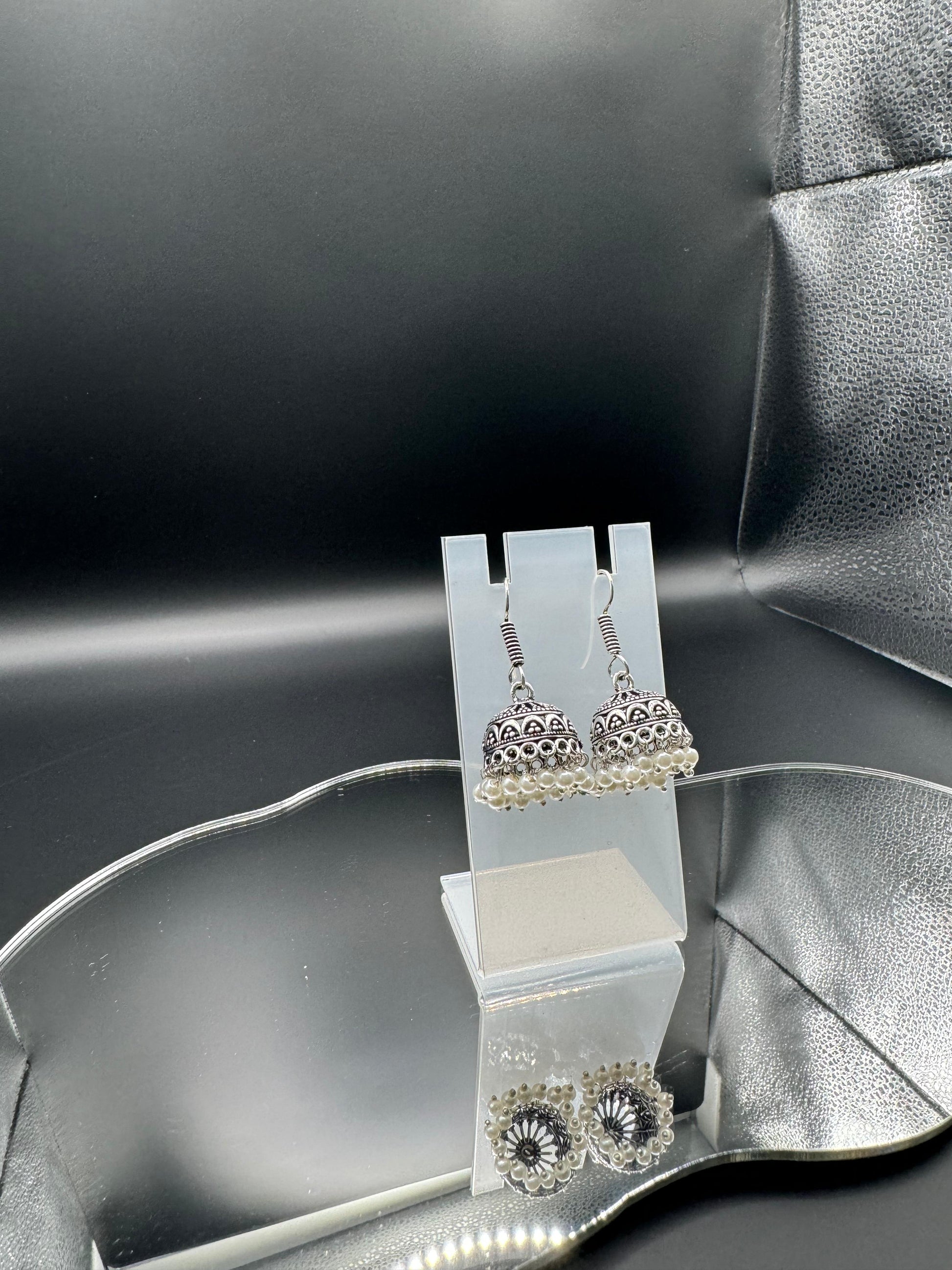 These elegant jhumka earrings feature a silver-toned base adorned with intricate detailing and a delicate drop of pearls. The classic design and timeless appeal make them the perfect accessory to complement any traditional or contemporary outfit.