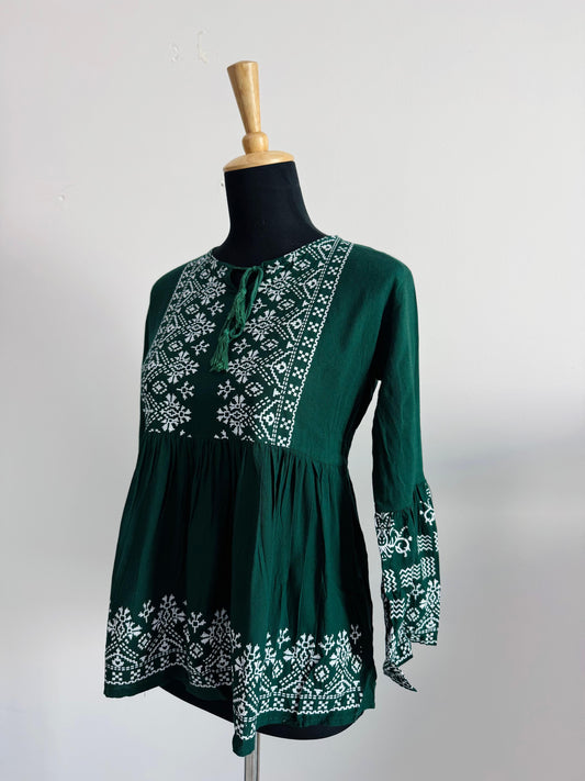 Dark Green Short Kurti with Tie-Up Neckline & White Print | Casual Ethnic Wear