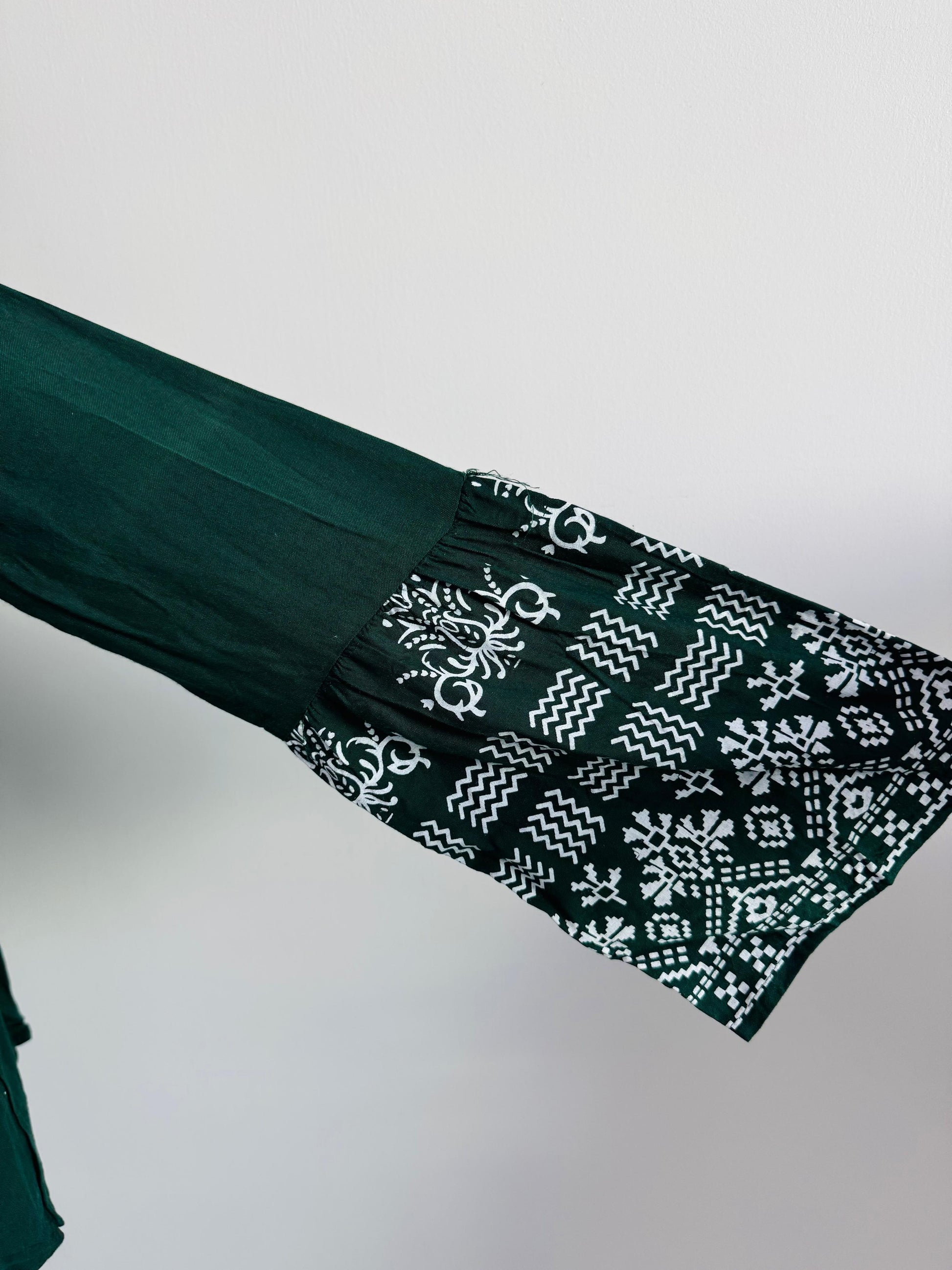 Accented with white printed detailing, this kurti creates a beautiful contrast against the rich green base, making it suitable for both casual wear and relaxed outings. The short length allows versatile styling, making it easy to pair with denim jeans, leggings, skirts, or layer under jackets and shirts for a modern fusion look.