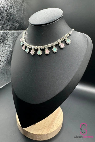This elegant necklace and earring set from Closet Secrets features sparkling stones and soft pink and green teardrop-shaped gems. The necklace is paired with matching earrings, creating a complete, coordinated look. Perfect for special occasions, this set adds a touch of luxury to any outfit. Comes beautifully packaged, making it a great gift option.