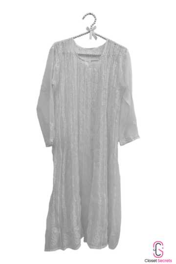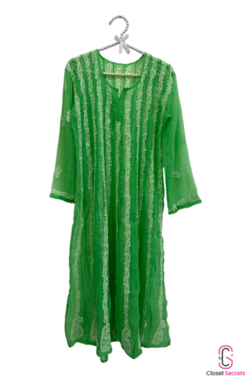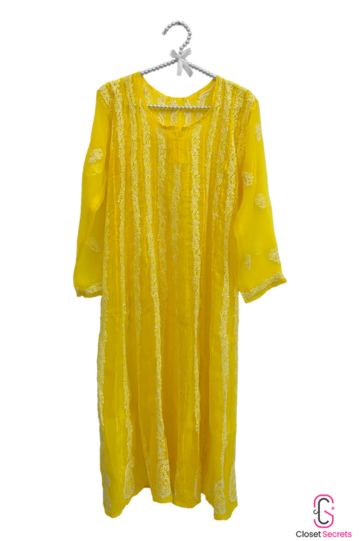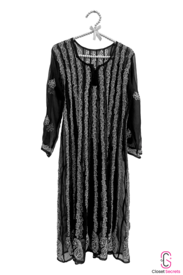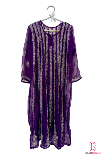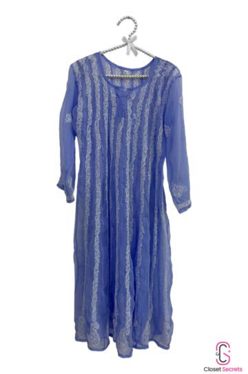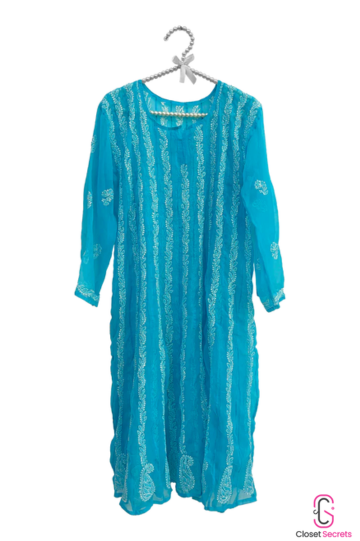 This georgette anarkali knee-length kurti flattering over the body curves giving a regal and elegant look. The georgette material is a comfy and lightweight material that can be adorned in warmer weather. This beautiful Anarkali kurti is embroidered all around from the top to the bottom hem, and the sleeve from shoulder to the wrist. Pair it with straight-fit pants and you are ready to shine in elegance.