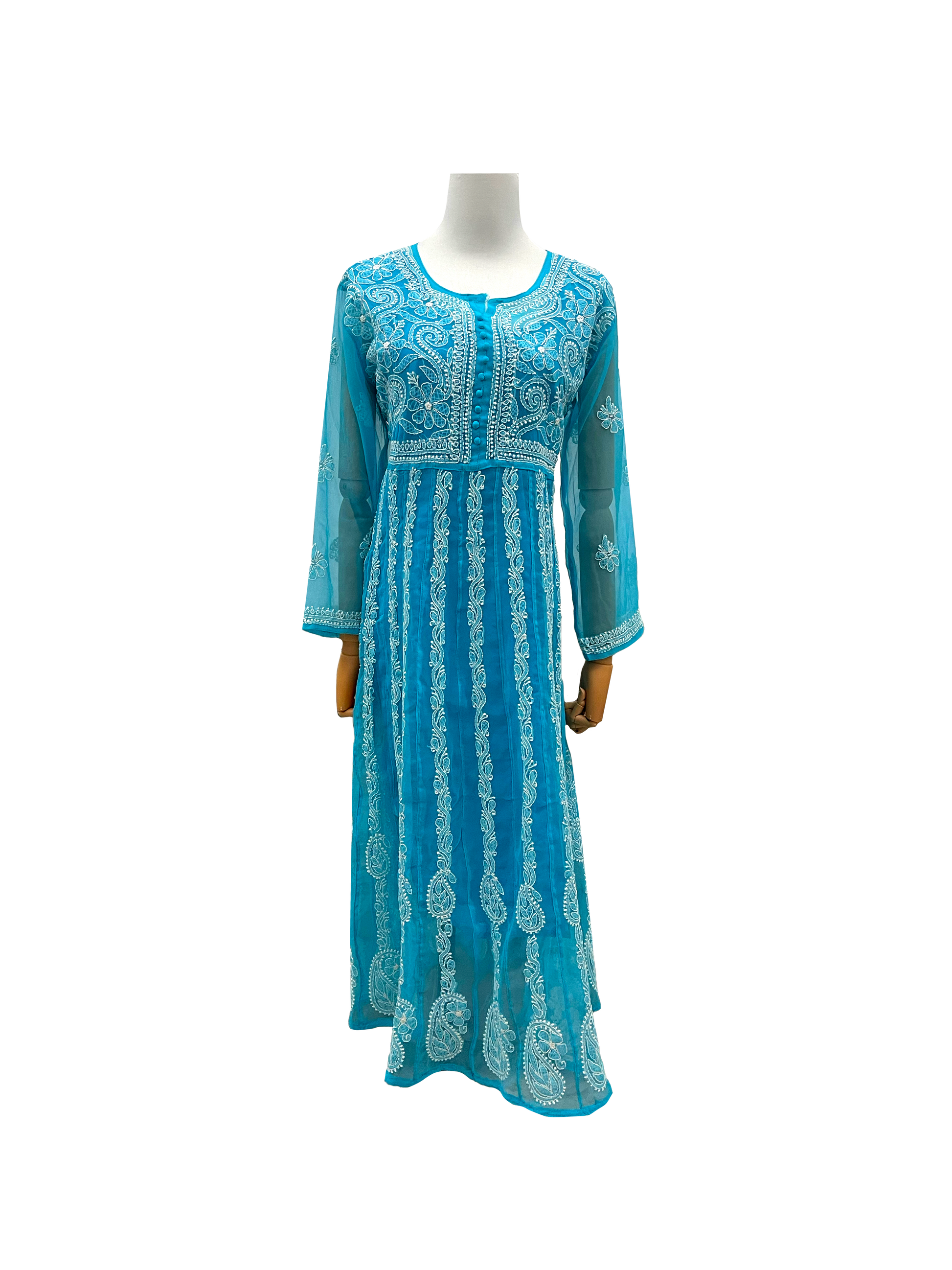 This stunning georgette Anarkali exudes elegance with its exquisite work meticulously detailed all over. The luxurious georgette fabric drapes beautifully, creating a flowing silhouette that flatters your figure. The matching embellishment adds a touch of sophistication and makes a captivating statement. Exquisite work is repeated throughout the entire Anarkali for a cohesive and visually stunning look. The Anarkali cut with a fitted bodice and flowing skirt flatters most body types.