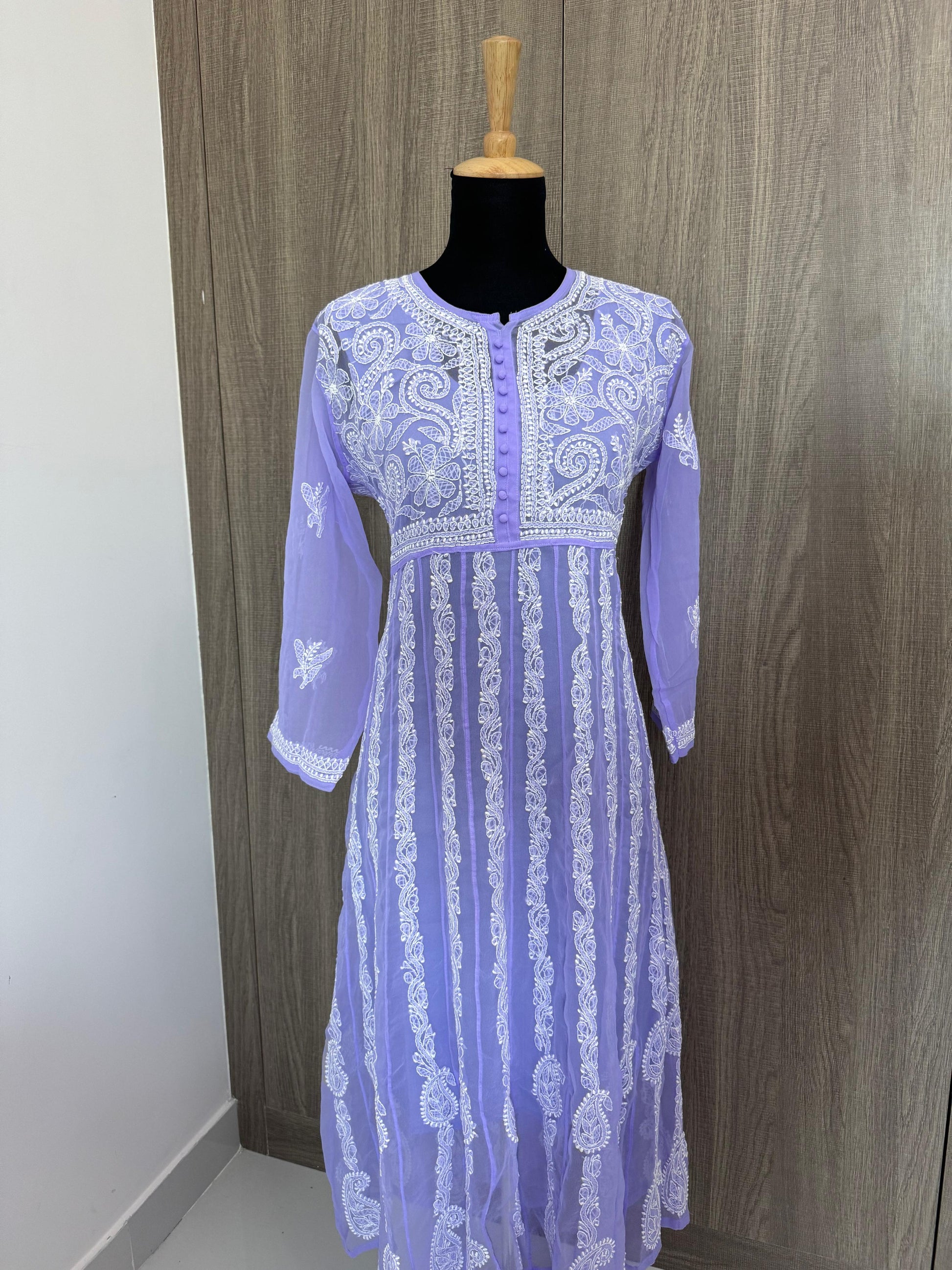 A best-selling Anarkali crafted in lightweight georgette, enhanced with delicate handmade Chikankari work for a timeless and elegant look. Designed with a flowy silhouette, it offers graceful movement and all-day comfort, making it ideal for festive moments and special occasions.