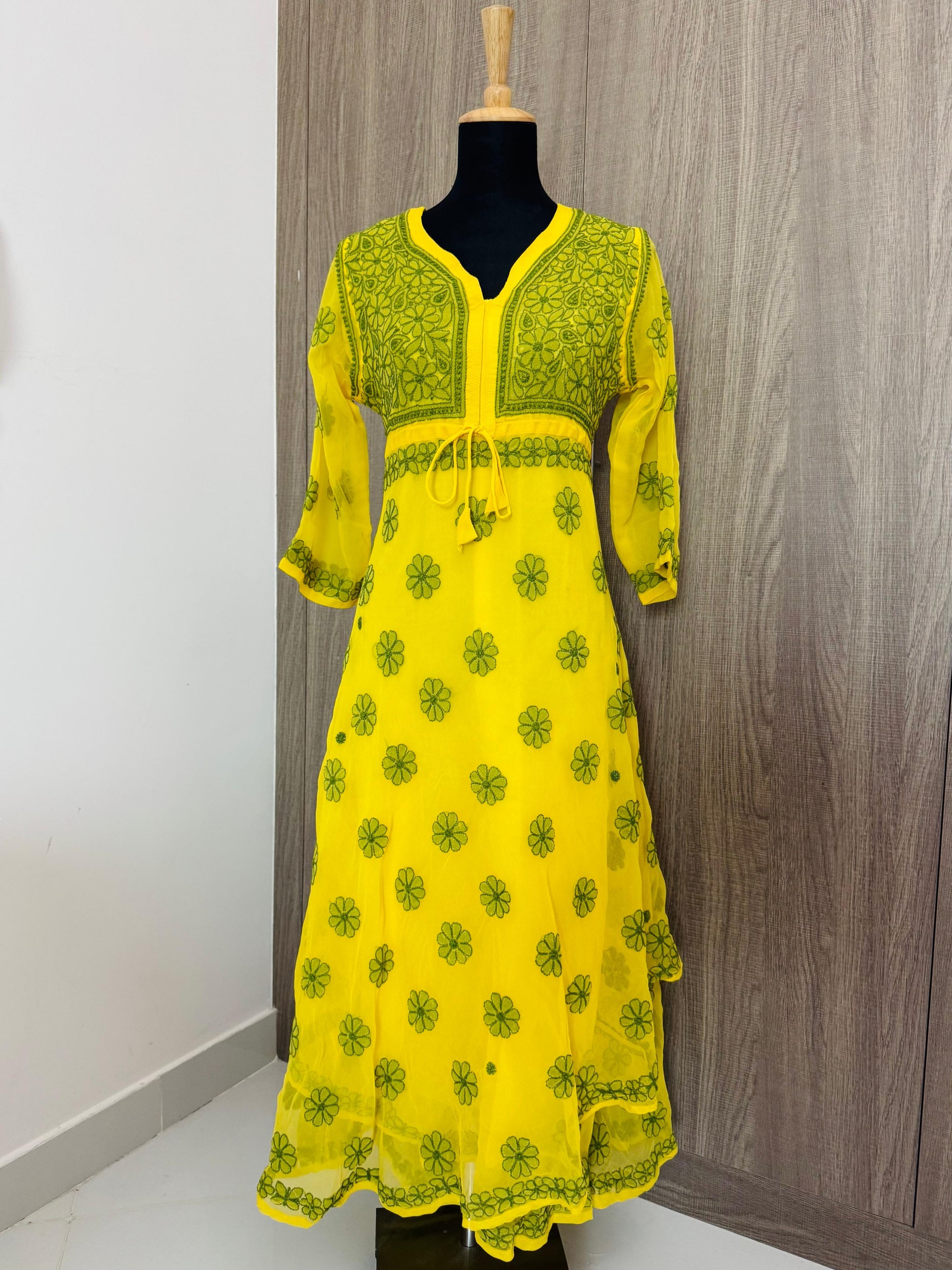 Bright, graceful, and effortlessly elegant, this handmade Chikankari Anarkali features a sunflower green print on a refreshing yellow base. Crafted in flowy georgette fabric, it offers a soft drape and beautiful movement, making it perfect for daytime wear.