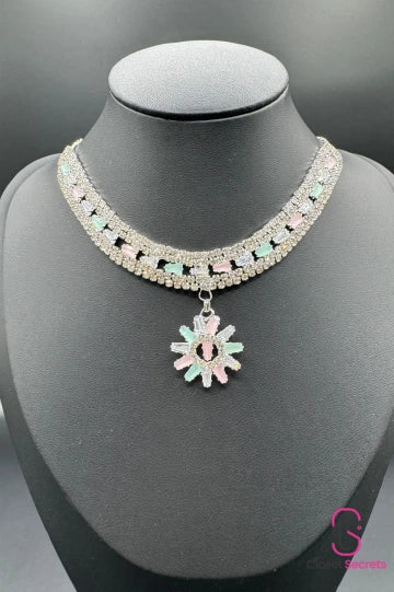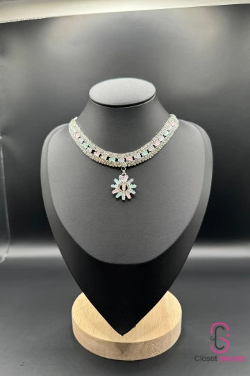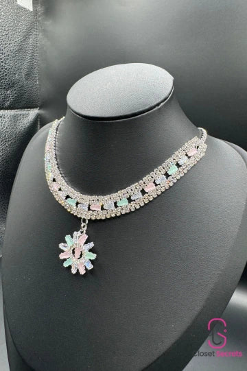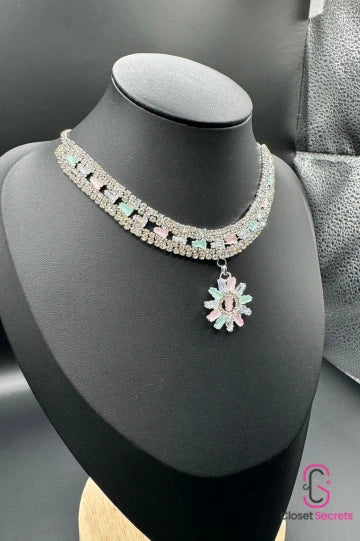 This beautiful necklace features a silver-tone design with pastel-colored stones in soft pink, blue, and green accents. A delicate floral pendant adds a touch of charm, making this piece perfect for adding elegance and subtle color to any outfit.