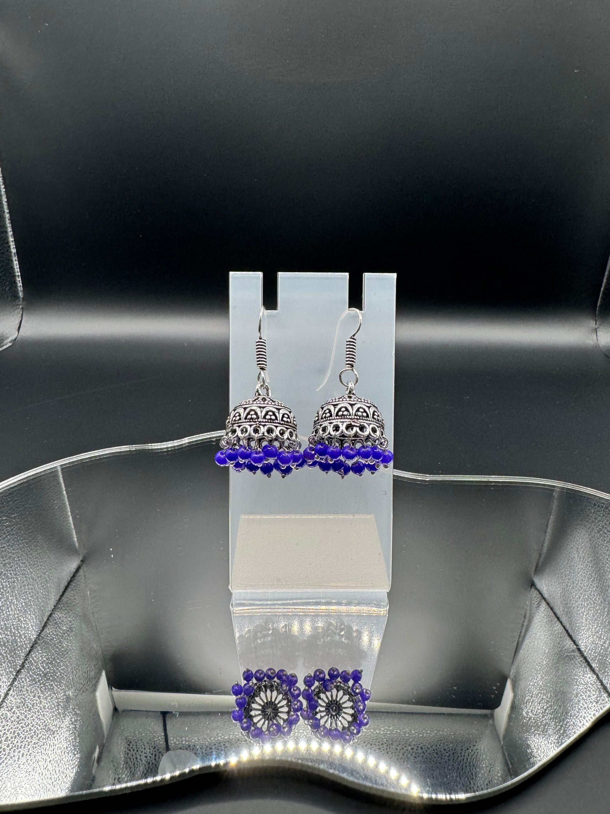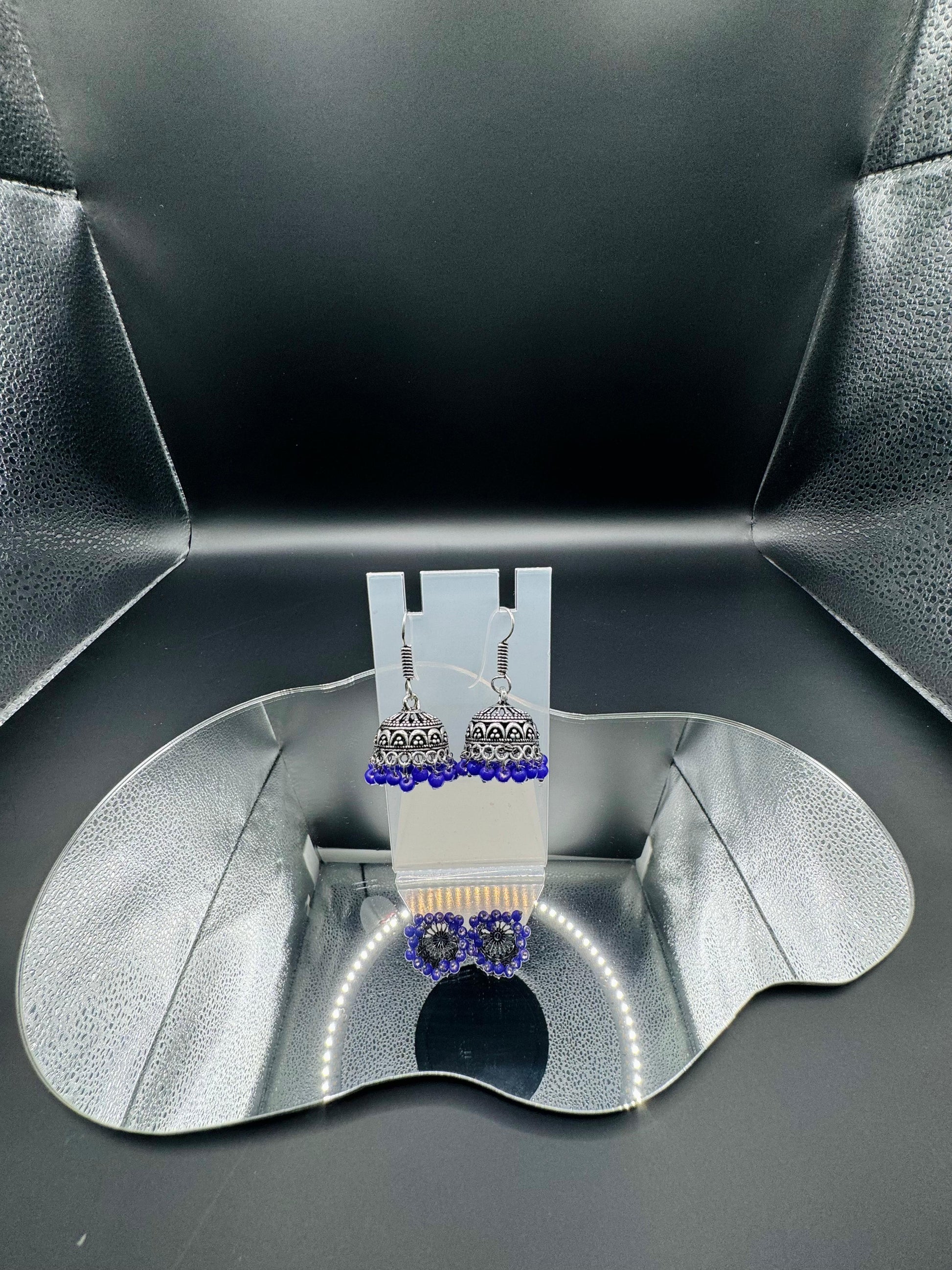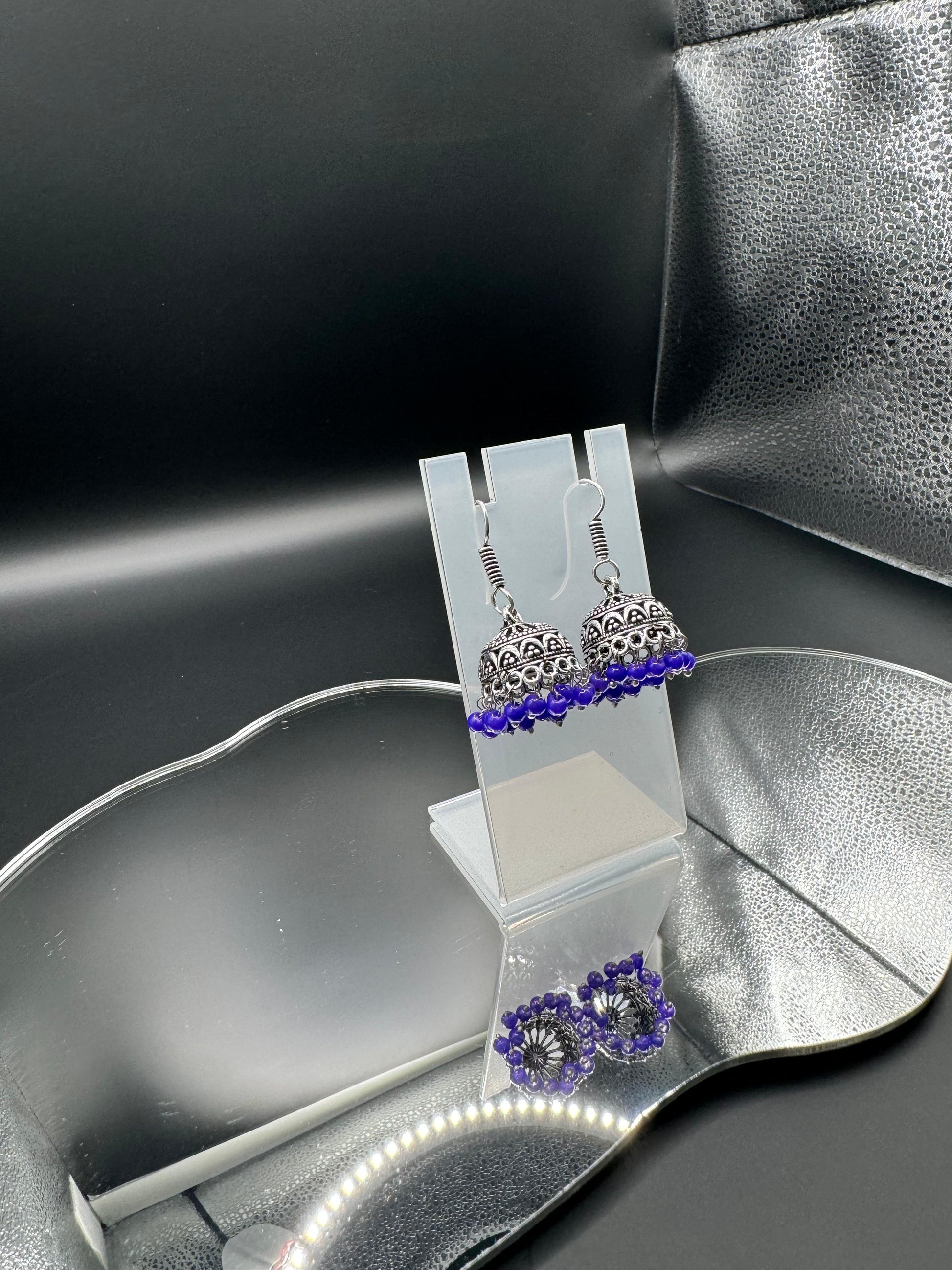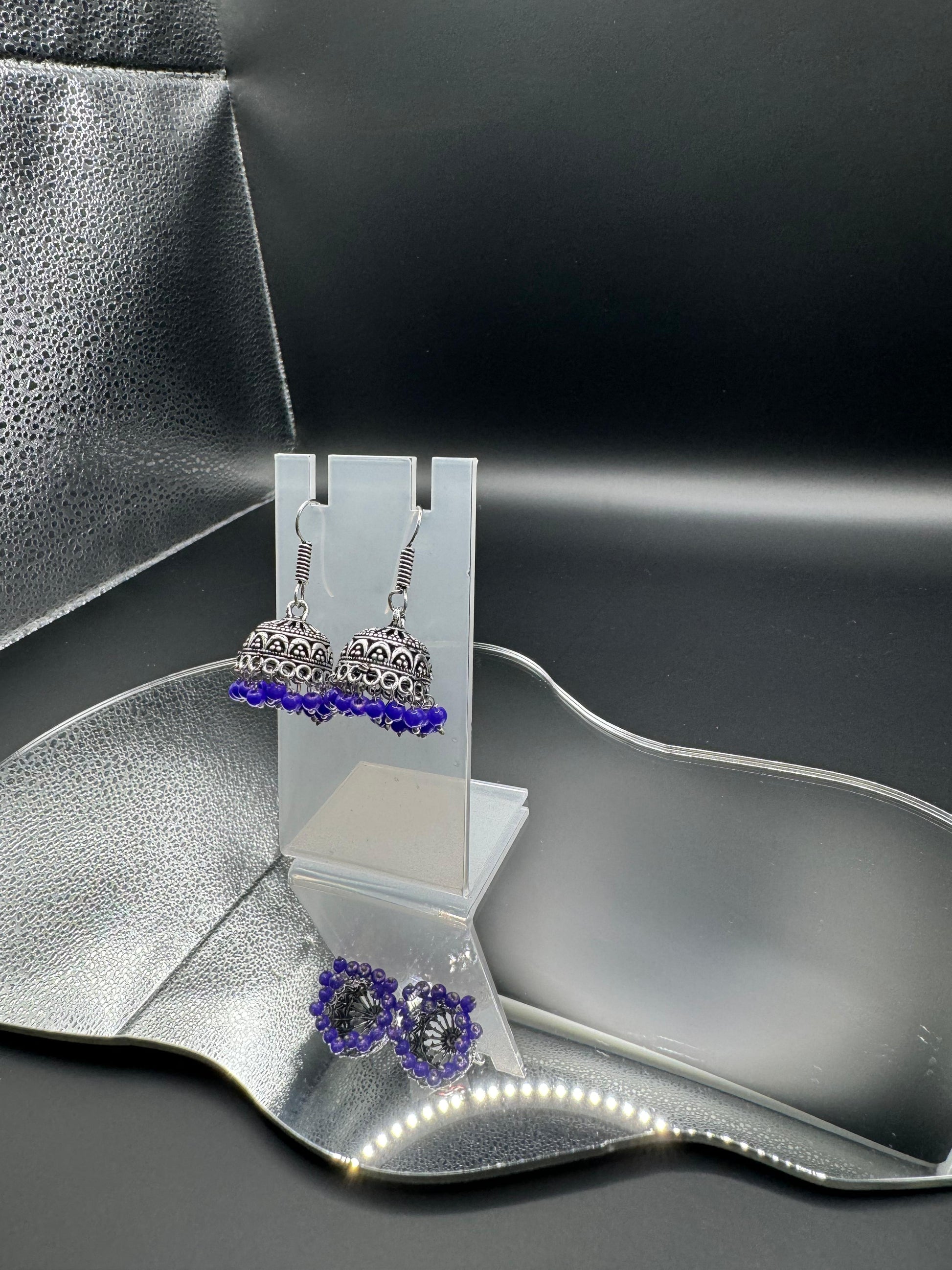 These elegant jhumka earrings feature a silver-toned base adorned with intricate detailing and a delicate drop of pearls. The classic design and timeless appeal make them the perfect accessory to complement any traditional or contemporary outfit.