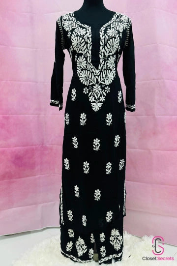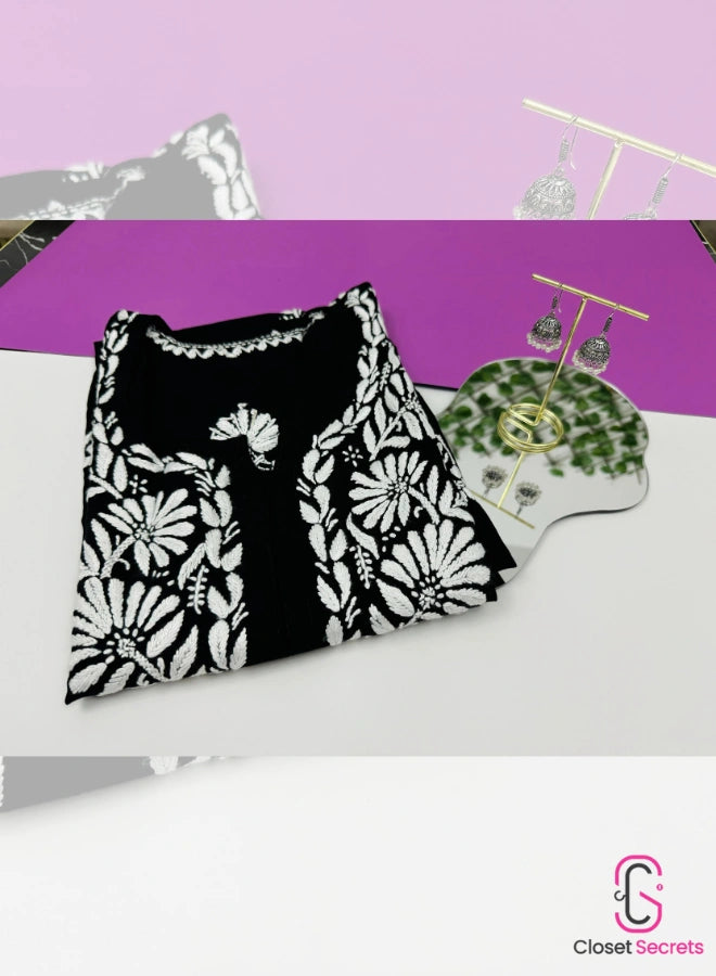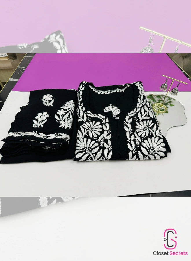This elegant black suit set features intricate white floral embroidery, bringing a touch of charm to your look. Made from soft, comfortable fabric, it’s perfect for festive occasions or casual outings. Paired with white pearl drop earrings, this combo adds a timeless, stylish flair to your wardrobe.