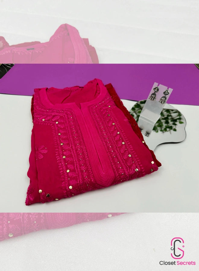 This stylish pink suit set is adorned with delicate embroidery and subtle mirror work, adding a touch of elegance to your look. The soft, comfortable fabric makes it perfect for festive occasions, casual gatherings, or a special day out. Paired with classic silver jhumka earrings, this combo brings an effortlessly chic vibe to any wardrobe.