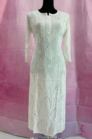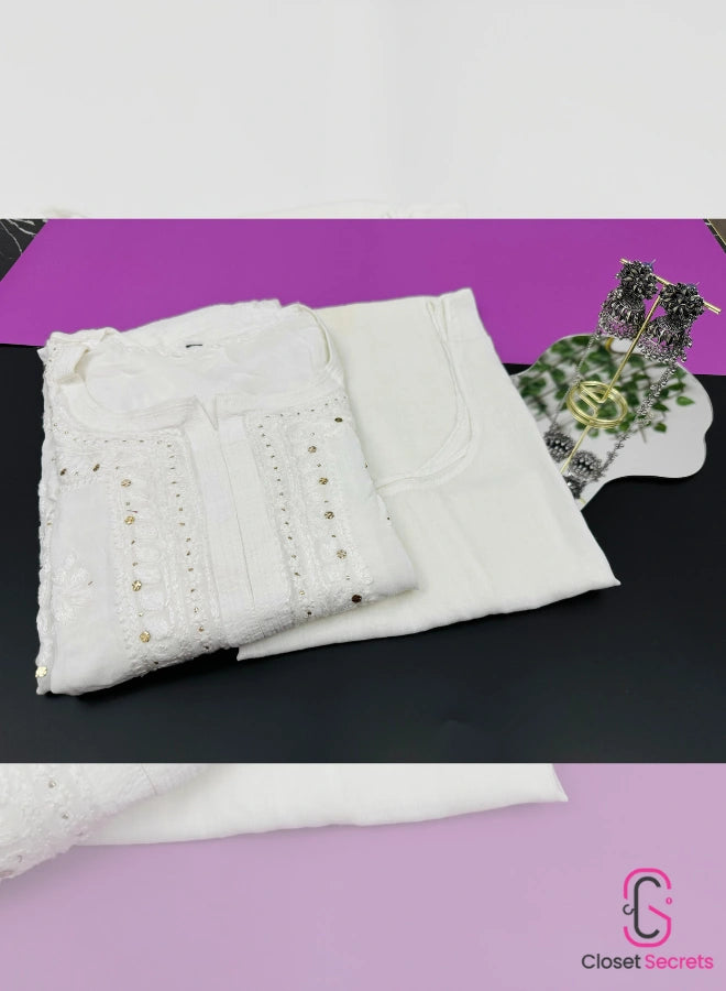 This stylish white suit set is adorned with delicate embroidery and subtle mirror work, adding a touch of elegance to your look. The soft, comfortable fabric makes it perfect for festive occasions, casual gatherings, or a special day out. Paired with classic oxidised jhumka earrings, this combo brings an effortlessly chic vibe to any wardrobe.